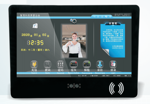 八大核心功能:錄臉、充值、查詢、密碼、掛失、解掛、發布通知、廣告。